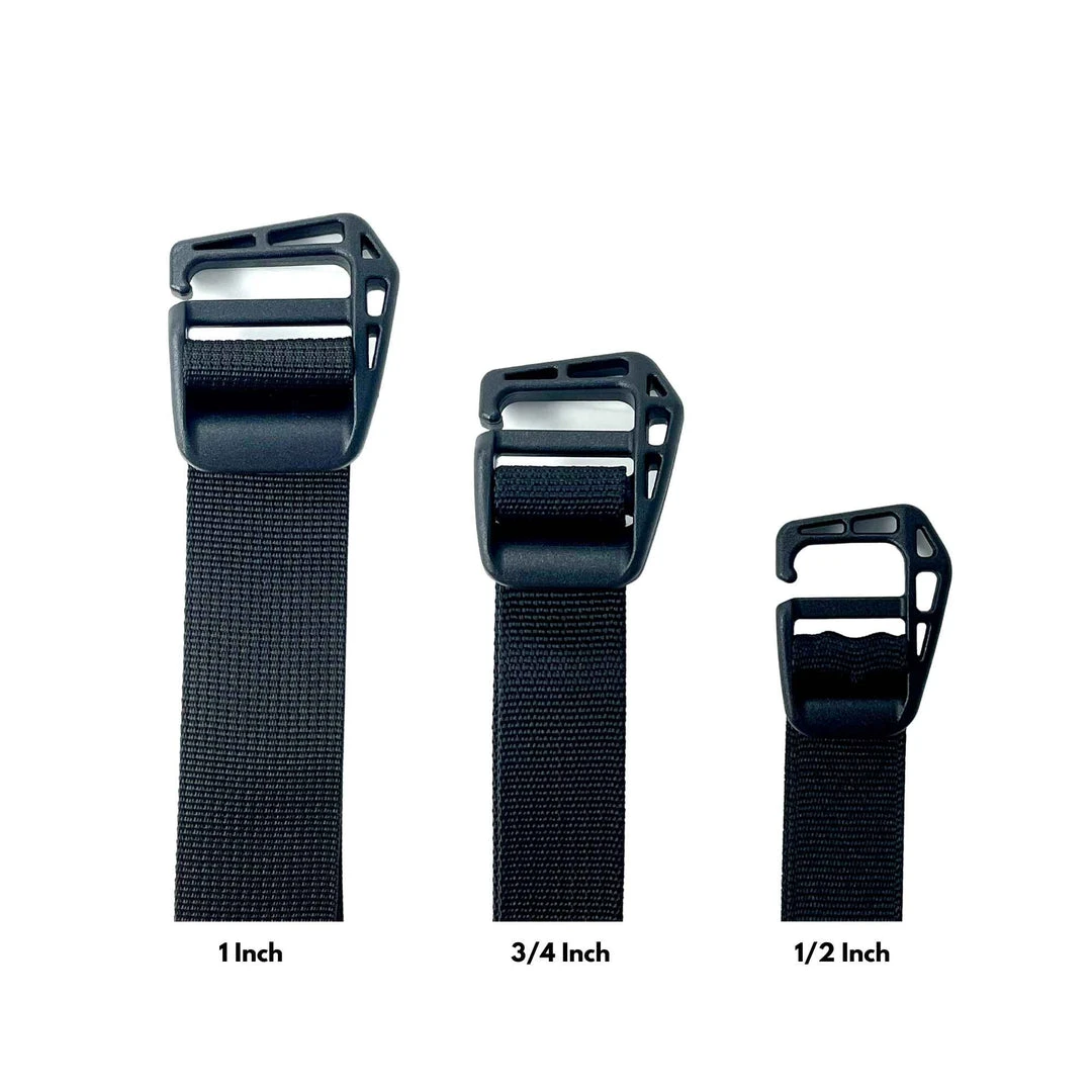 This part allows you to quickly “hook” into a webbing loop – say on a bag or pouch – then cinch down the other side with an adjustable tensioner. This is the “right-handed” variant, meaning the hook is on the left side when product is oriented correctly,